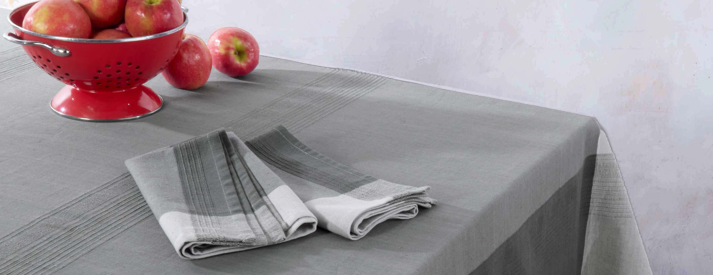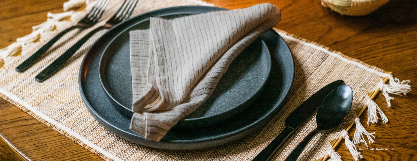 Banana stem fibers, local river grass, coconut leaf stems are among the natural fibers interlaced with yarn to create this stunning collection for the table.