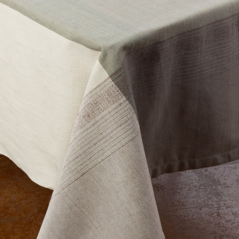 This is a pure cotton tablecloth, woven by hand on manual looms and enhanced with a complex weave to create a raised texture, which conveys the beauty of handloom weaves and cannot be reproduced on machines.