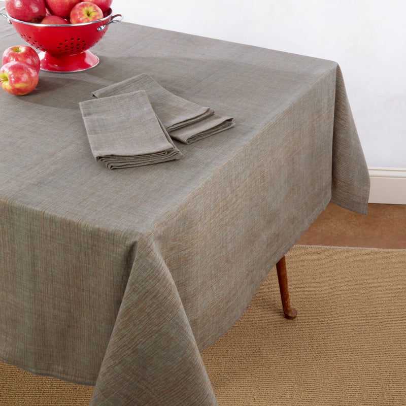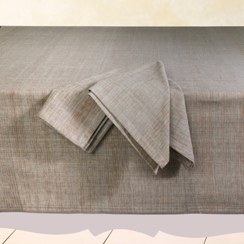 This tablecloth is made from organic cotton yarns that have been hand-dyed using the Ikat technique, a textile patterning tie-dye process that involves resist-dyeing the yarns prior to hand weaving the fabric. This involves blocking certain areas of a textile from receiving dye which creates for lighter and darker colors to be achieved in the same dyeing process. The Ikat-dyed threads are then used to weave patterned fabric.